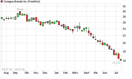 Mit dem Rücksetzer auf 16,11 EUR hat die Conagra Brands-Aktie (ISIN US2058871029) am 18.07.2025 ein neues 10-Jahres-Tief erreicht und damit den Kurs vom 17.07.2025 eingestellt.