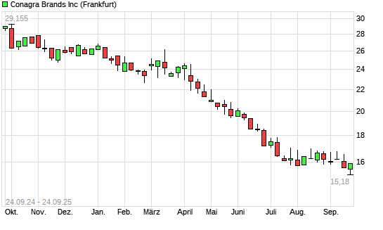 Mit dem Rücksetzer auf 15,19 EUR hat die Conagra Brands-Aktie (ISIN US2058871029) am 23.09.2025 ein neues 10-Jahres-Tief erreicht und damit den Kurs vom 22.09.2025 eingestellt.