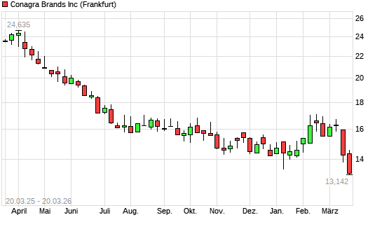 Mit dem Rücksetzer auf 13,14 EUR hat die Conagra Brands-Aktie (ISIN US2058871029) am 19.03.2026 ein neues 10-Jahres-Tief erreicht und damit den Kurs vom 18.03.2026 eingestellt.
