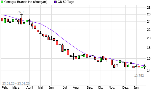 Mit dem Anstieg auf 14,72 EUR hat die Conagra Brands-Aktie am 22.01.2026 die 50-Tage-Linie nach oben gekreuzt.