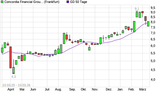 Mit dem Rücksetzer auf 7,60 EUR hat die Concordia Financial Group-Aktie am 09.03.2026 die 50-Tage-Linie nach unten gekreuzt.