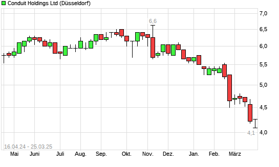 Mit dem Rücksetzer auf 4,06 EUR hat die Conduit Holdings-Aktie (ISIN BMG243851091) am 24.03.2025 ein neues 12-Monats-Tief erreicht und damit den Kurs vom 20.03.2025 eingestellt.Die Conduit ...weiterlesen