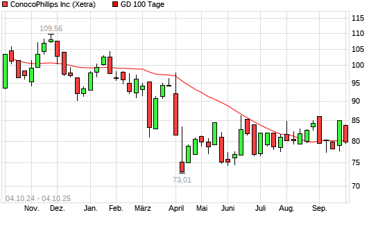 Mit dem Rücksetzer auf 79,74 EUR hat die ConocoPhillips-Aktie am 03.10.2025 die 100-Tage-Linie nach unten gekreuzt.