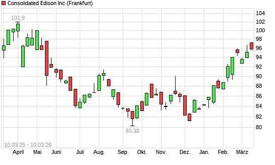 Mit dem Anstieg auf 96,88 EUR hat die Consolidated Edison-Aktie (ISIN US2091151041) am 09.03.2026 ein neues 6-Monats-Hoch erreicht und damit den Kurs vom 05.03.2026 eingestellt.