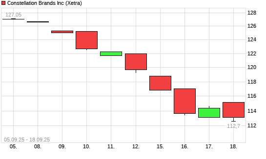Mit dem Rücksetzer auf 112,70 EUR hat die Constellation Brands-Aktie (ISIN US21036P1084) am 17.09.2025 ein neues 5-Jahres-Tief erreicht und damit den Kurs vom 16.09.2025 eingestellt.