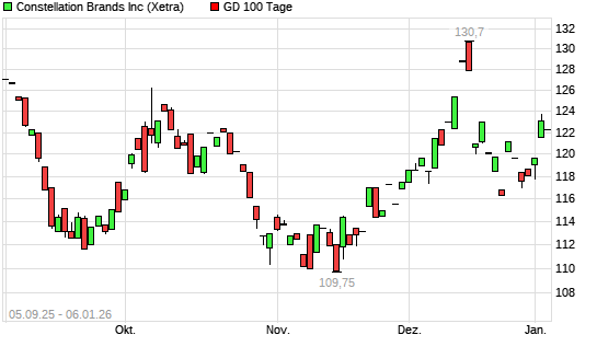 Mit dem Anstieg auf 121,80 EUR hat die Constellation Brands-Aktie am 05.01.2026 die 100-Tage-Linie nach oben gekreuzt.