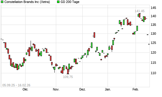 Mit dem Rücksetzer auf 126,95 EUR hat die Constellation Brands-Aktie am 16.02.2026 die 200-Tage-Linie nach unten gekreuzt.