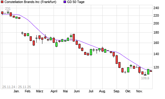 Mit dem Rücksetzer auf 115,05 EUR hat die Constellation Brands-Aktie am 24.11.2025 die 50-Tage-Linie nach unten gekreuzt.