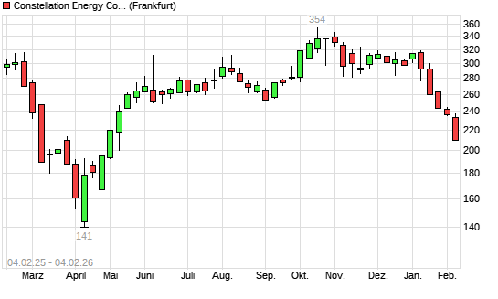 Mit dem Rücksetzer auf 223,80 EUR hat die Constellation Energy Corporation-Aktie (ISIN US21037T1097) am 03.02.2026 ein neues 6-Monats-Tief erreicht und damit den Kurs vom 02.02.2026 eingestellt.