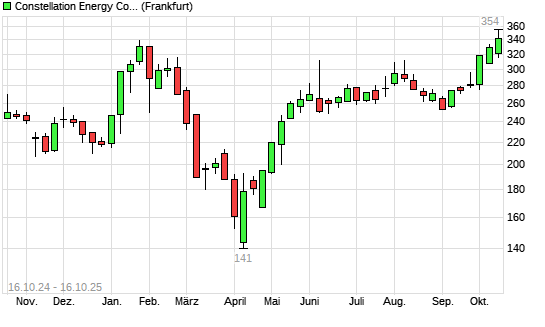Mit dem Anstieg auf 342,35 EUR hat die Constellation Energy Corporation-Aktie (ISIN US21037T1097) am 15.10.2025 ein neues All-Time-High erreicht und damit den Kurs vom 14.10.2025 eingestellt.
