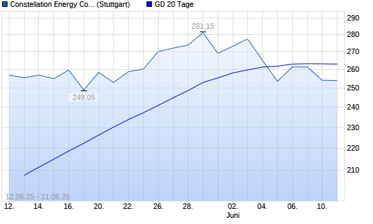 Mit dem Rücksetzer auf 255,10 EUR hat die Constellation Energy Corporation-Aktie am 10.06.2025 die 20-Tage-Linie nach unten gekreuzt.