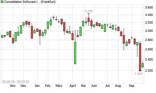 Mit dem Rücksetzer auf 2.235,00 EUR hat die Constellation Software-Aktie (ISIN CA21037X1006) am 29.09.2025 ein neues 12-Monats-Tief erreicht und damit den Kurs vom 26.09.2025 eingestellt.