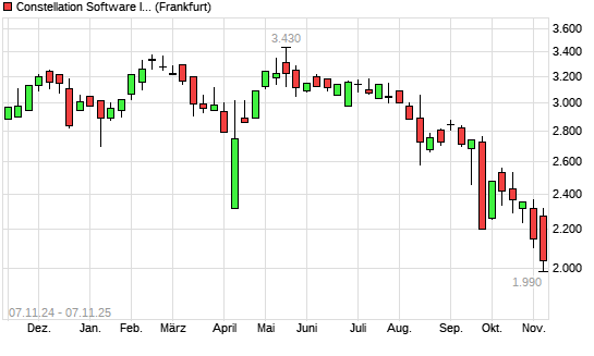 Mit dem Rücksetzer auf 2.075,00 EUR hat die Constellation Software-Aktie (ISIN CA21037X1006) am 06.11.2025 ein neues 12-Monats-Tief erreicht und damit den Kurs vom 30.10.2025 eingestellt.