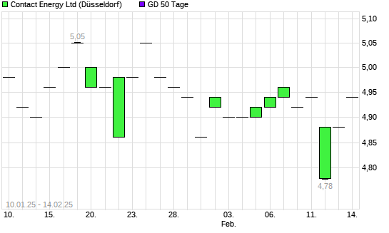 Mit dem Anstieg auf 5,05 EUR hat die Contact Energy-Aktie am 13.02.2025 die 50-Tage-Linie nach oben gekreuzt.