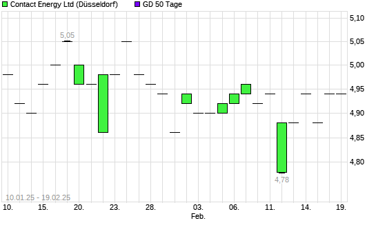 Mit dem Anstieg auf 5,10 EUR hat die Contact Energy-Aktie am 18.02.2025 die 50-Tage-Linie nach oben gekreuzt.