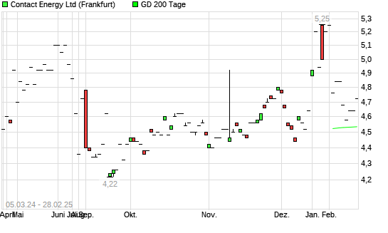 Mit dem Rücksetzer auf 4,68 EUR hat die Contact Energy-Aktie am 04.03.2025 die 200-Tage-Linie nach unten gekreuzt.