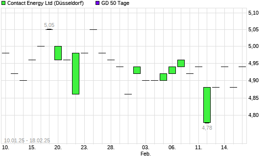 Mit dem Rücksetzer auf 5,00 EUR hat die Contact Energy-Aktie am 17.02.2025 die 50-Tage-Linie nach unten gekreuzt.