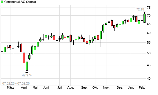 Mit dem Anstieg auf 70,50 EUR hat die Continental-Aktie (ISIN DE0005439004) am 06.02.2026 ein neues 3-Jahres-Hoch erreicht und damit den Kurs vom 04.02.2026 eingestellt.
