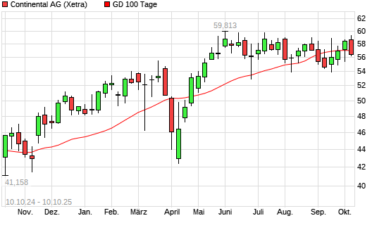 Mit dem Anstieg auf 57,32 EUR hat die Continental-Aktie am 09.10.2025 die 100-Tage-Linie nach oben gekreuzt.