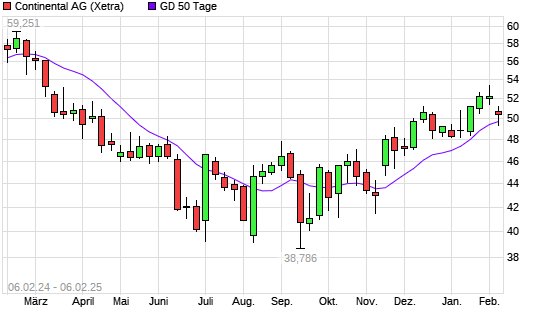 Mit dem Rücksetzer auf 65,00 EUR hat die Continental-Aktie am 05.02.2025 die 50-Tage-Linie nach unten gekreuzt.