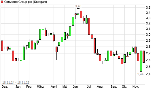 Mit dem Rücksetzer auf 2,54 EUR hat die ConvaTec Group-Aktie (ISIN GB00BD3VFW73) am 17.11.2025 ein neues 12-Monats-Tief erreicht und damit den Kurs vom 25.09.2025 eingestellt.