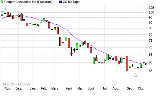 Mit dem Rücksetzer auf 58,50 EUR hat die Cooper Companies-Aktie am 13.10.2025 die 50-Tage-Linie nach unten gekreuzt.