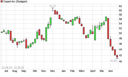 Mit dem Rücksetzer auf 41,24 EUR hat die Copart-Aktie (ISIN US2172041061) am 20.06.2025 ein neues 12-Monats-Tief erreicht und damit den Kurs vom 18.06.2025 eingestellt.