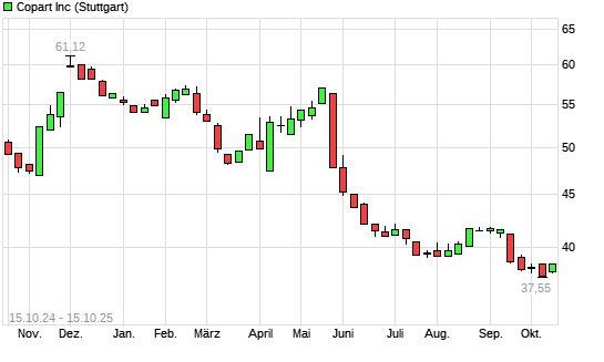 Mit dem Rücksetzer auf 37,41 EUR hat die Copart-Aktie (ISIN US2172041061) am 14.10.2025 ein neues 12-Monats-Tief erreicht und damit den Kurs vom 10.10.2025 eingestellt.