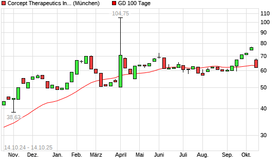 Mit dem Rücksetzer auf 61,84 EUR hat die Corcept Therapeuticsorpora-Aktie am 13.10.2025 die 100-Tage-Linie nach unten gekreuzt.