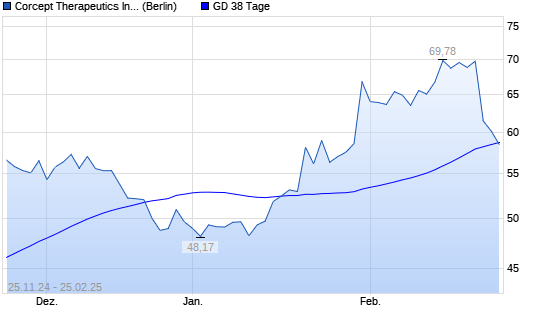 Mit dem Rücksetzer auf 58,76 EUR hat die Corcept Therapeuticsorpora-Aktie am 24.02.2025 die 38-Tage-Linie nach unten gekreuzt.