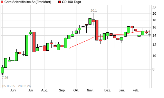 Mit dem Rücksetzer auf 14,25 EUR hat die Core Scientific St-Aktie am 27.02.2026 die 100-Tage-Linie nach unten gekreuzt.