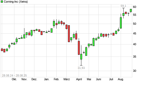 Mit dem Anstieg auf 58,03 EUR hat die Corning-Aktie (ISIN US2193501051) am 27.08.2025 ein neues 10-Jahres-Hoch erreicht und damit den Kurs vom 26.08.2025 eingestellt.