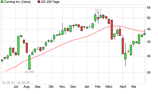 Mit dem Rücksetzer auf 43,55 EUR hat die Corning-Aktie am 30.05.2025 die 100-Tage-Linie nach unten gekreuzt.