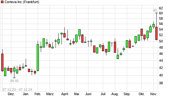 Mit dem Anstieg auf 57,71 EUR hat die Corteva-Aktie (ISIN US22052L1044) am 06.11.2024 ein neues 12-Monats-Hoch erreicht und damit den Kurs vom 30.10.2024 eingestellt.