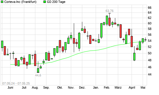 Mit dem Rücksetzer auf 53,79 EUR hat die Corteva-Aktie am 06.05.2025 die 200-Tage-Linie nach unten gekreuzt.