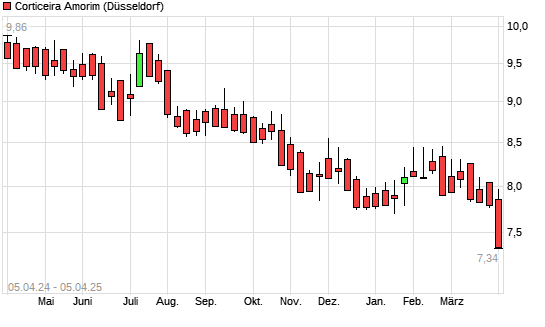 Mit dem Rücksetzer auf 7,53 EUR hat die Corticeira Amorim-Aktie (ISIN PTCOR0AE0006) am 04.04.2025 ein neues 5-Jahres-Tief erreicht und damit den Kurs vom 03.04.2025 eingestellt.