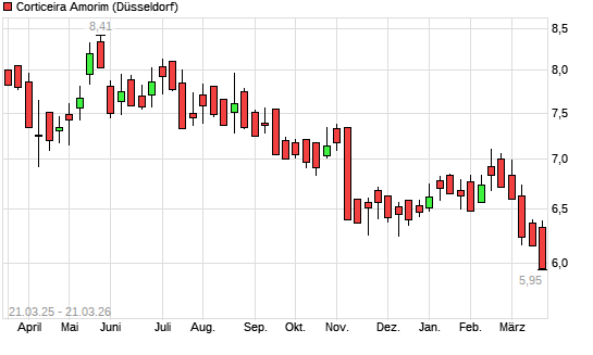 Mit dem Rücksetzer auf 6,10 EUR hat die Corticeira Amorim-Aktie (ISIN PTCOR0AE0006) am 20.03.2026 ein neues 5-Jahres-Tief erreicht und damit den Kurs vom 18.03.2026 eingestellt.