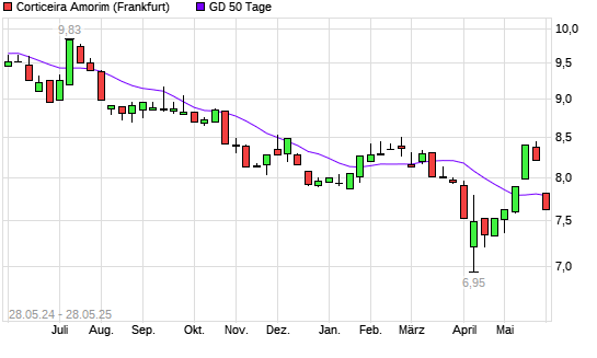 Mit dem Rücksetzer auf 7,73 EUR hat die Corticeira Amorim-Aktie am 27.05.2025 die 50-Tage-Linie nach unten gekreuzt.