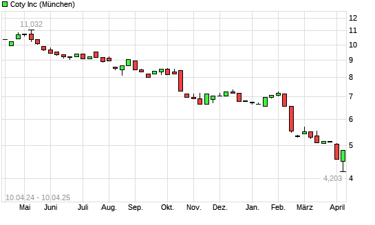 Mit dem Rücksetzer auf 4,15 EUR hat die Coty-Aktie (ISIN US2220702037) am 09.04.2025 ein neues 3-Jahres-Tief erreicht und damit den Kurs vom 07.04.2025 eingestellt.