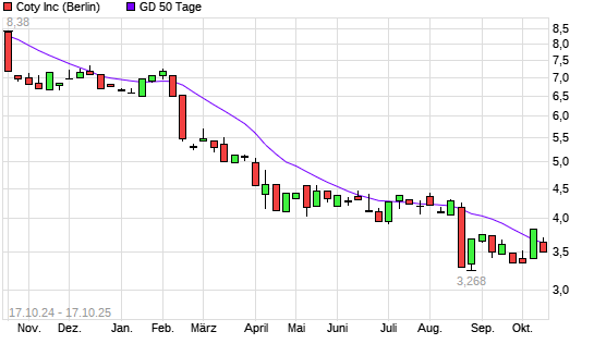 Mit dem Rücksetzer auf 3,61 EUR hat die Coty-Aktie am 16.10.2025 die 50-Tage-Linie nach unten gekreuzt.