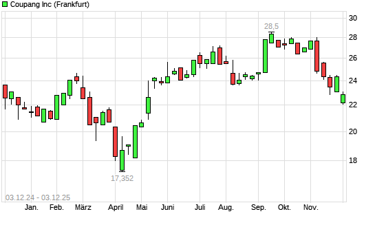 Mit dem Rücksetzer auf 22,90 EUR hat die Coupang A-Aktie (ISIN US22266T1097) am 02.12.2025 ein neues 6-Monats-Tief erreicht und damit den Kurs vom 01.12.2025 eingestellt.