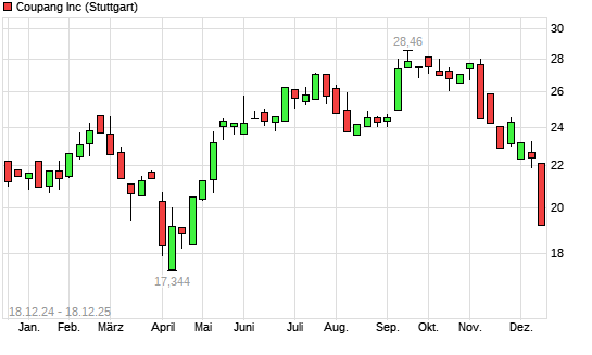 Mit dem Rücksetzer auf 19,19 EUR hat die Coupang A-Aktie (ISIN US22266T1097) am 17.12.2025 ein neues 6-Monats-Tief erreicht und damit den Kurs vom 16.12.2025 eingestellt.