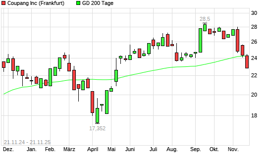 Mit dem Anstieg auf 24,28 EUR hat die Coupang A-Aktie am 20.11.2025 die 200-Tage-Linie nach oben gekreuzt.