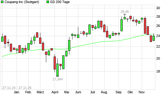 Mit dem Anstieg auf 24,46 EUR hat die Coupang A-Aktie am 26.11.2025 die 200-Tage-Linie nach oben gekreuzt.