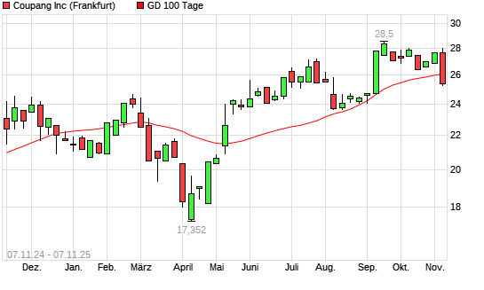 Mit dem Rücksetzer auf 25,25 EUR hat die Coupang A-Aktie am 06.11.2025 die 100-Tage-Linie nach unten gekreuzt.