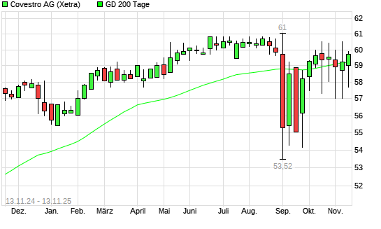 Mit dem Anstieg auf 59,52 EUR hat die Covestro-Aktie am 12.11.2025 die 200-Tage-Linie nach oben gekreuzt.