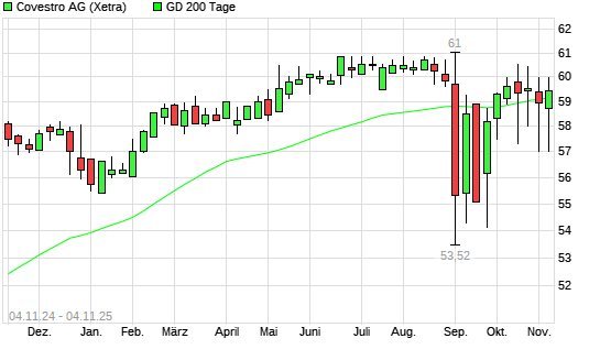 Mit dem Rücksetzer auf 58,76 EUR hat die Covestro-Aktie am 03.11.2025 die 200-Tage-Linie nach unten gekreuzt.