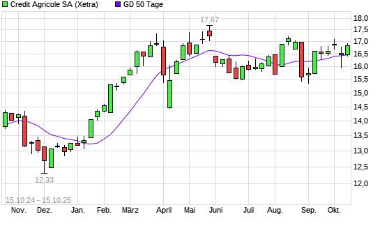 Mit dem Rücksetzer auf 16,40 EUR hat die Credit Agricole-Aktie am 14.10.2025 die 50-Tage-Linie nach unten gekreuzt.