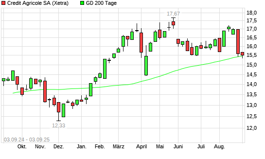 Mit dem Rücksetzer auf 15,43 EUR hat die Credit Agricole-Aktie am 02.09.2025 die 200-Tage-Linie nach unten gekreuzt.Die Credit Agricole-Aktie befand sich seit dem 16.01.2025 im langfristigen ...weiterlesen