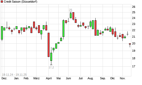 Mit dem Rücksetzer auf 20,00 EUR hat die Credit Saison-Aktie (ISIN JP3271400008) am 18.11.2025 ein neues 6-Monats-Tief erreicht und damit den Kurs vom 17.11.2025 eingestellt.Die Credit ...weiterlesen
